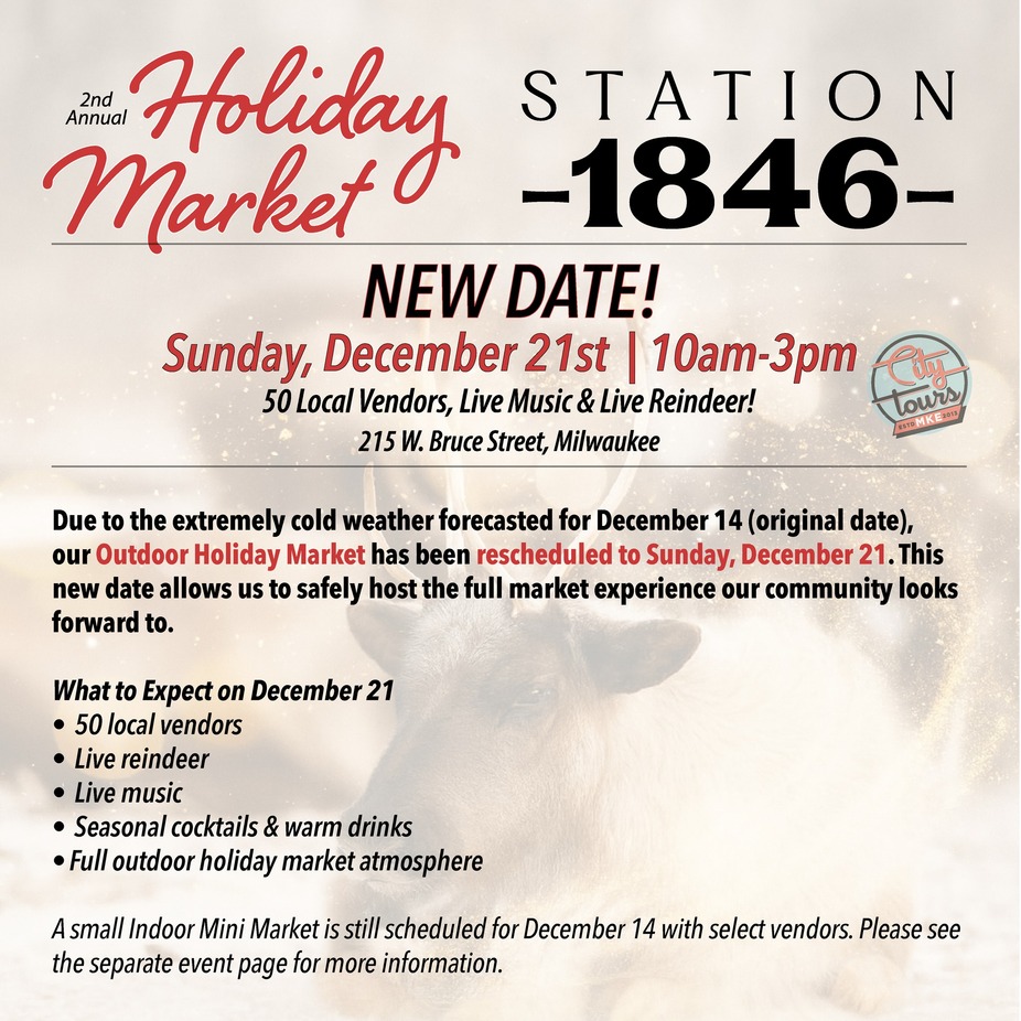 Milwaukee, WI —12/11/25— City Tours MKE announces that its outdoor Winter Wonderland Market, originally scheduled for December 14, 2025, has been rescheduled to December 21, 2025 due to inclement weather forecasts and to ensure the safety and comfort of all vendors and guests.